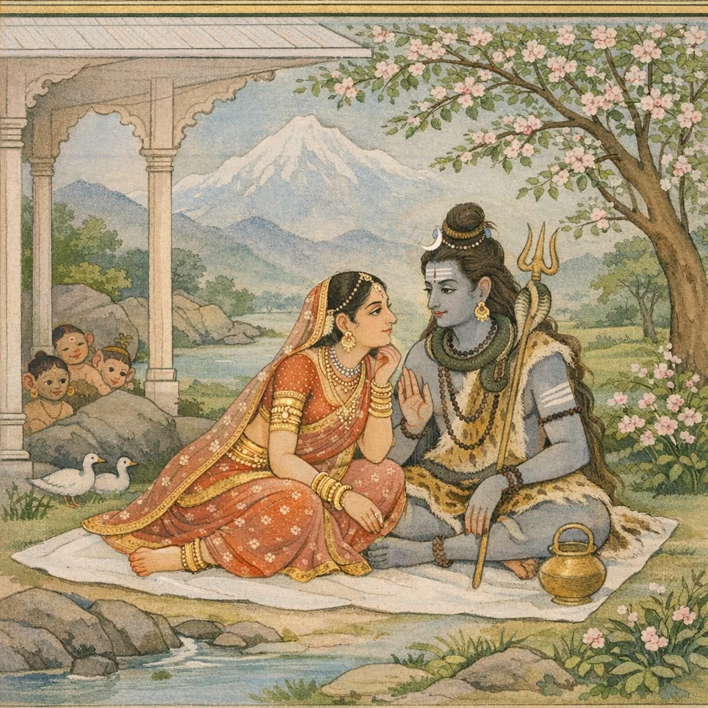 Dengan tangan memegang chāmara (kipas ekor yak) untuk mengipas, mereka melayani Sang Dewi dan Sang Dewa—Tuhan yang sempurna, Penguasa Agung segala alam. Sesudah itu, terjalinlah wacana yang dikasihi, demi hiburan Mahesha dan Permaisurinya, serta demi perlindungan manusia di dunia—mereka yang telah menjadikan Śiva sebagai tempat berlindung.