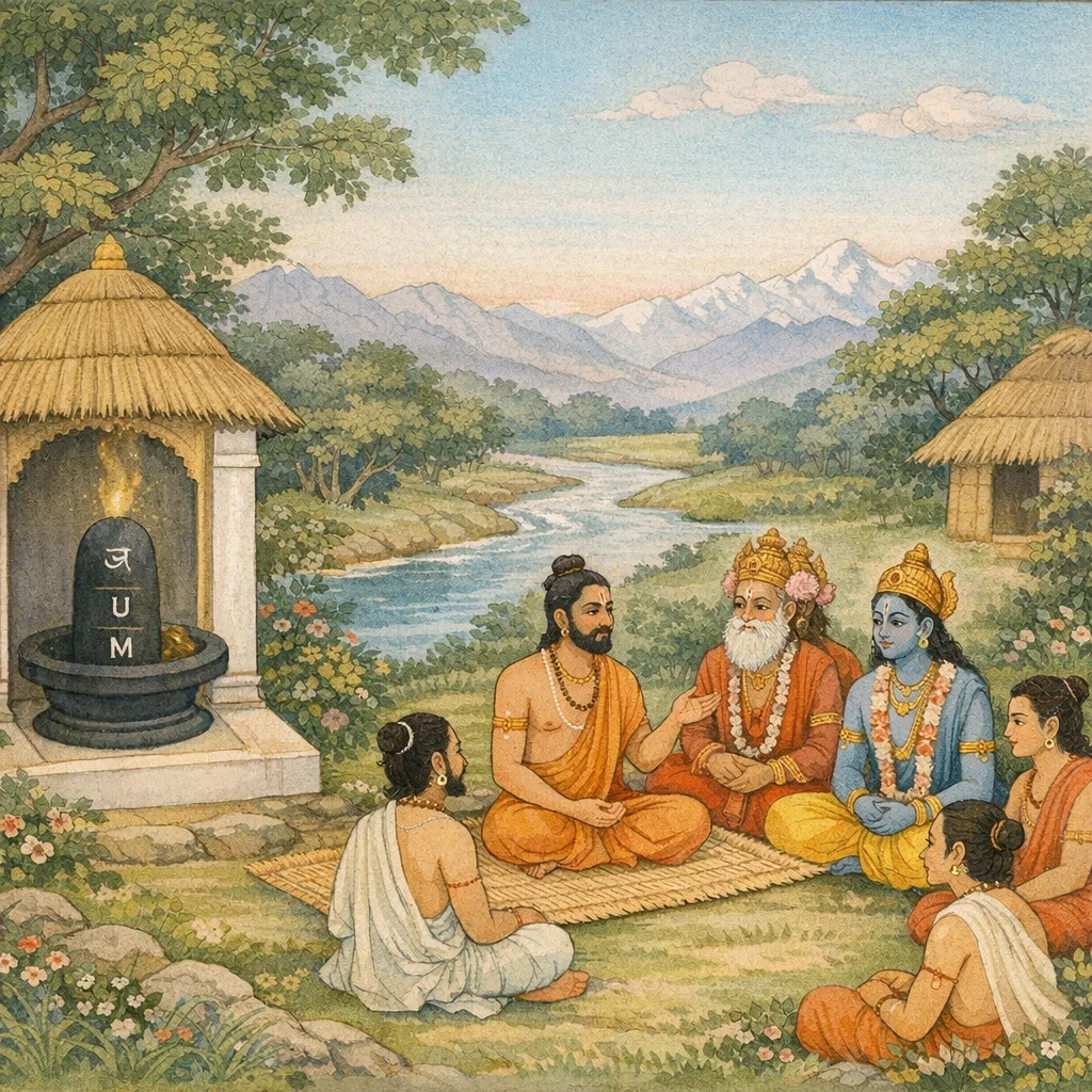 Di sana, suku kata “A” menjadi Ṛgveda; suku kata “U” menjadi Yajurveda yang tidak binasa. Suku kata “M” lahir sebagai Sāmaveda, dan nāda—gema batin—menjadi Atharva-śruti. Maka Oṁ diajarkan sebagai benih wahyu Veda, menunjuk kepada Śiva sebagai Tuhan bunyi (Śabda) dan penganugeraha ilmu pembebasan.