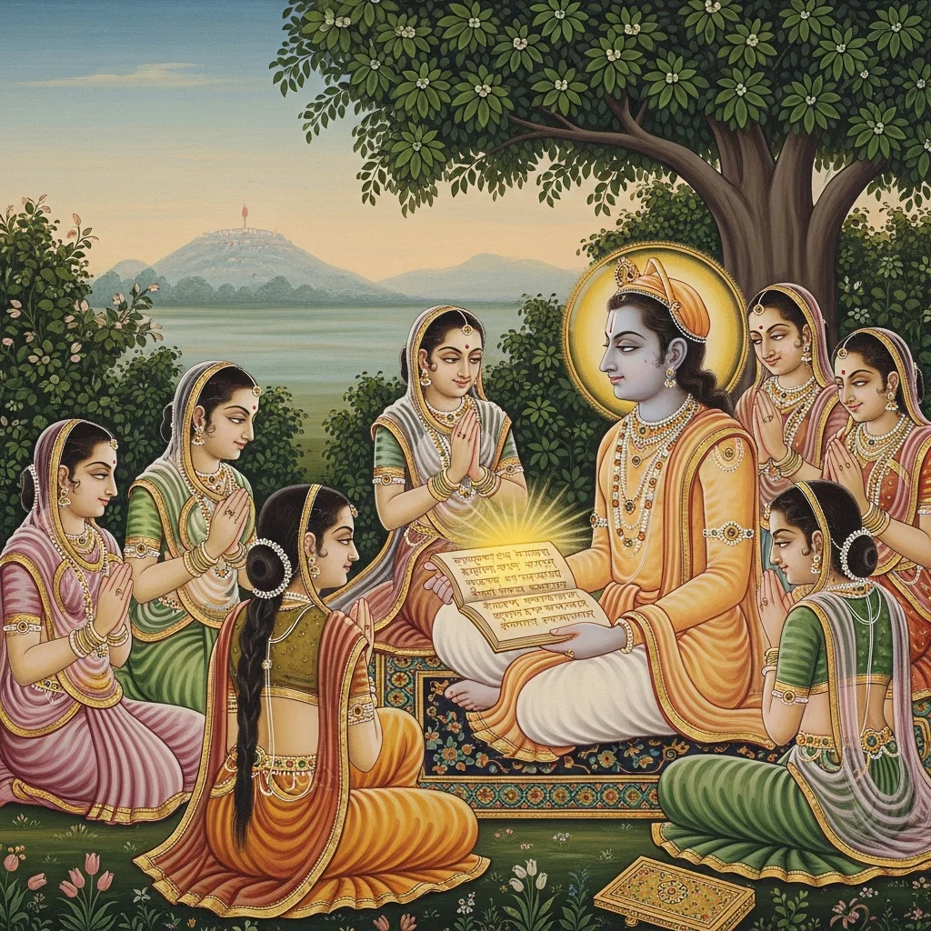 Rather than listing a single merit formula, the discourse frames merit in terms of devotional alignment: hearing sacred narratives, serving Vraja-sites, and sustaining community life around tīrtha-locations are presented as spiritually efficacious practices.