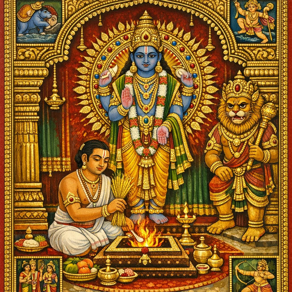 Viṣṇu as Vāsudeva/Keśava/Hari is central, with strong emphasis on Sudarśana-cakra and Narasiṃha; the rite also salutes Varāha, Vāmana, Trivikrama, Rāma, Vaikuṇṭha, Nara, and Nārāyaṇa.