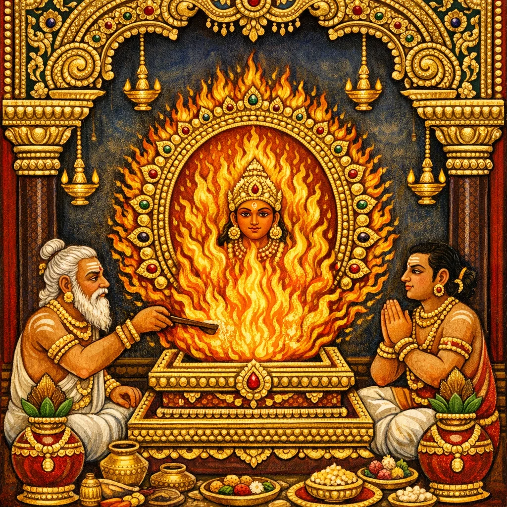သန့်ရှင်းသော ဗျာဟෘတိ (vyāhṛti) များကို ရွတ်ဆိုပြီးနောက်၊ ပူဇော်သန့်စင်ထားသော မီးကို ပဒ္မ (ကြာပန်း) အလယ်၌ တည်နေသည်ဟု ဓ్యာနပြုရမည်။ ထိုမီးသည် ဝိုင်ရှ္ဏဝ (Vaishnava) သဘောရှိ၍ လျှာ ၇ ခုရှိကာ နေတစ်ကောဋိများကဲ့သို့ တောက်ပရောင်ခြည်ရှိ၏။