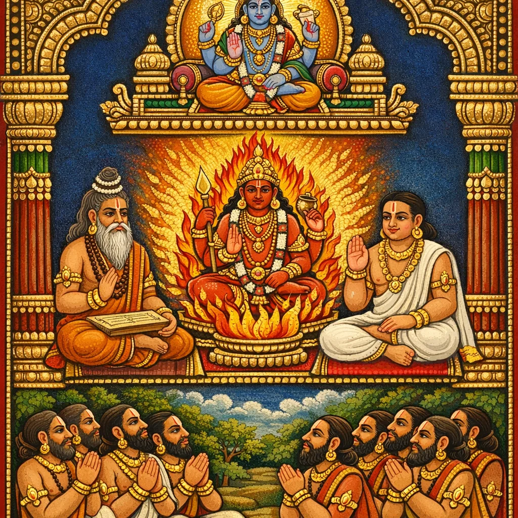 အဂ္နိက ပြောသည်—“ငါသည် ဗိဿနု ဖြစ်၏; ငါသည် အချိန်၏မီး (ကာလာဂ္နိ) အဖြစ် ရုဒြ ဖြစ်၏။ ငါသည် သင်အား ဗိဒ္ယာ၏အနှစ်သာရကို ကြေညာမည်—အရာအားလုံး၏ သင်ယူမှုအနှစ်သာရဖြစ်သော ပုရာဏကို၊ အရာအားလုံးဖြစ်ပြီး အရာအားလုံး၏ အကြောင်းရင်းဖြစ်သော အရာကို။”