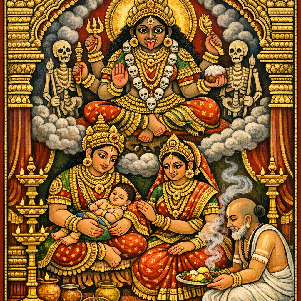 ခရိရှရာ (khicrī)၊ ပူပ (အချိုမုန့်)၊ ဒဓိ (နို့ချဉ်) စသည်တို့ဖြင့် ဘလိ (bali) ပူဇော်ကာ ရေချိုးခြင်းနှင့် မီးခိုးသုတ်သင်/အမွှေးအကြိုင်ထွန်းခြင်းကိုလည်း ပြုလုပ်၍ သာယာစေသော အပူဇော်ပွဲကို ဆောင်ရွက်ရမည်။ အချိန်စက်ဝန်း၏ ကိုးနှစ်မြောက်တွင် လက်မောင်းများ၌ ကွဲသံ/တုန်ခါသံနှင့် ဂర్జန (ဟိန်းသံ) ပေါ်လာခြင်းသည် ကြောက်ရွံ့ဖွယ် နိမိတ်ဖြစ်သည်။