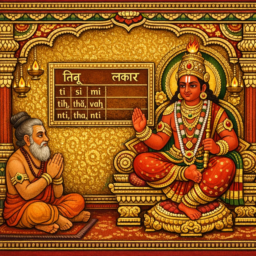 ဤအধ্যာယသည် tiṅ အဆုံးသတ်များ (ကြိယာပုဂ္ဂိုလ်အဆုံးသတ်) ကို ဗျာကရဏာလက်စွဲအဖြစ် တိုတောင်းစွာ ရှင်းလင်းပြီး bhāva (အမည်မဖော် လုပ်ရပ်/အခြေအနေ), karma (ဝတ္ထုဦးတည်/အကမ္မ), kartṛ (အကောင်အထည်ဖော်သူ/အကမ္မမဟုတ်) တို့အလိုက် အသုံးချပုံကို ဖော်ပြသည်။ အရင် uṇādi အကြောင်းအရာနှင့် စာသားဆက်စပ်မှု ချို့ယွင်းနေကြောင်း မှတ်သားပြီးနောက် lakāra များ၏ အဓိပ္ပါယ်နယ်ပယ်ကို စနစ်တကျ ရေတွက်သည်—laṭ ပစ္စုပ္ပန်၊ liṅ အမိန့်/ဆန္ဒနှင့် မင်္ဂလာဆုတောင်း၊ loṭ အမိန့်နှင့် ကောင်းချီး၊ laṅ အဝေးအတိတ်၊ luṅ နှင့် liṭ အတိတ် (liṭ သည် မမြင်ရ/အလွဲသိ အတိတ်ကို အလေးပေး)၊ luṭ/ḷṅ အနာဂတ်။ ထို့နောက် ပုဂ္ဂိုလ်အဆုံးသတ်များနှင့် parasmaipada/ātmanepada ခွဲခြားမှုကို bhū (“ဖြစ်/ရှိ”) နှင့် edh (“တိုးတက်/မီးတောက်”) စသည့် ဓာတုများဖြင့် ပုံစံပြကာ အခြား ဓာတုအုပ်စုများနှင့် vikaraṇa မှတ်ချက်များကိုပါ ထည့်သွင်းသည်။ နောက်ဆုံးတွင် san (လိုချင်မှု), ṇic (ဖြစ်စေမှု), yaṅ (ထပ်ခါထပ်ခါ), yaṅ-luk တို့ကဲ့သို့ ဆင်းသက်ပုံစံများကို အသုံးအနှုန်းဥပမာများနှင့် “rūpaka” မော်ဒယ်ပုံစံများဖြင့် ချိတ်ဆက်ပြသသည်။