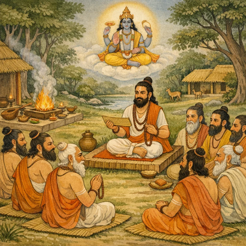 အဝဘ္ဟෘထ အဆုံးသတ်ပွဲပြီးနောက် ရေချိုးပြီးသော စူတသည် ပုရာဏပြောသူတို့အနက် အမြတ်ဆုံးဖြစ်၏။ သူ အေးချမ်းစွာ ထိုင်နေစဉ် နိုင်မိရှာရဏ္ယာ၌ နေထိုင်သူများက သူ့ကို မေးမြန်းကြ၏။