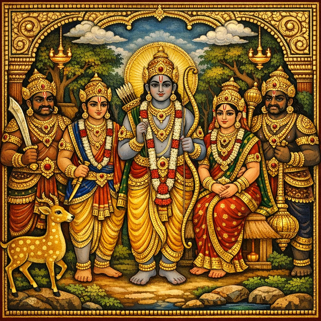 ਜਨਸਥਾਨ ਵਿੱਚ ਗੋਦਾਵਰੀ ਦੇ ਕੰਢੇ ਪੰਚਵਟੀ ਵਿੱਚ ਰਹਿੰਦੇ ਹੋਏ, ਉੱਥੇ ਡਰਾਉਣੀ ਸ਼ੂਰਪਣਖਾ ਉਨ੍ਹਾਂ ਨੂੰ ਖਾਣ ਲਈ ਆ ਪਹੁੰਚੀ।