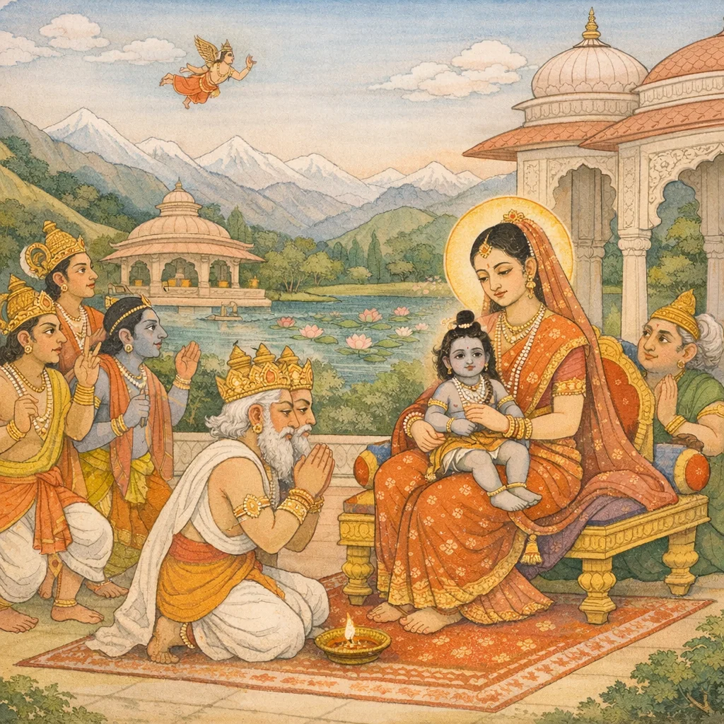 ਦੇਵ ਸਭਾ ਵਿੱਚ ਦੇਵੀ ਦੇ ਹਾਜ਼ਰ ਹੋਣ ਸਮੇਂ, ਵ੍ਰਿਸ਼ਭਧਵਜ ਮਹਾਦੇਵ ਨੇ ਮਾਲਾ ਫੜੀ ਅਤੇ ਬਾਲਕ-ਰੂਪ ਧਾਰ ਕੇ ਕ੍ਰੀੜਾ-ਲੀਲਾ ਕਰਨ ਲੱਗ ਪਿਆ।