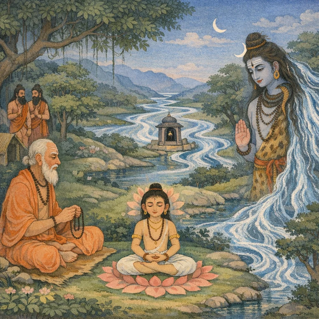 ਮੈਂ ਦਰਿਆਵਾਂ ਦੇ ਵਿਚਕਾਰ ਉਸ ਪਵਿੱਤਰ ਥਾਂ ਵਿੱਚ ਪਰਮੇਸ਼ਵਰ ਸਦਾਸ਼ਿਵ ਨੂੰ ਖੜ੍ਹਾ ਵੇਖਿਆ—ਤ੍ਰਿਨੇਤ੍ਰ, ਦਸਭੁਜ, ਸ਼ਾਂਤ, ਪੰਜਵਕਤ੍ਰ—ਪਸ਼ੂ ਦੇ ਪਾਸ਼ਾਂ ਨੂੰ ਸ਼ਾਂਤ ਕਰਨ ਵਾਲਾ ਪਰਮ ਪਤੀ।