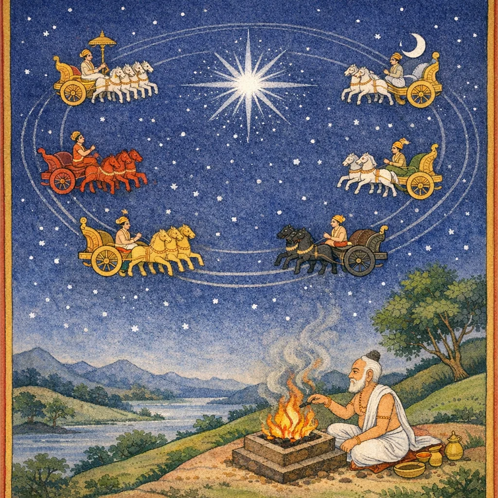 They are said to be ‘dhruva-nibaddha’—fastened to Dhruva—and driven by ‘vāta-raśmi’ (wind-like cords/forces), moving like a rotating firebrand (alāta-cakra). This frames celestial motion as orderly, regulated, and non-random.
