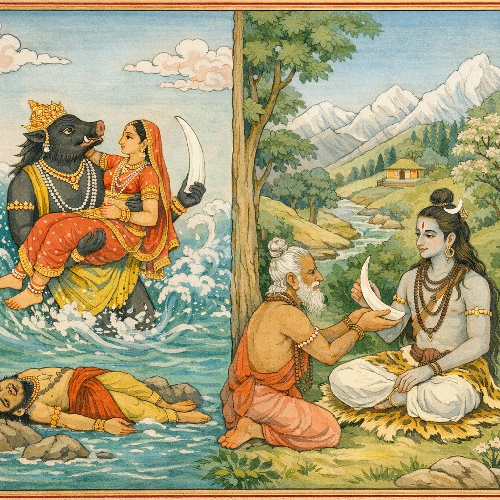 ਨਿਰਮਲ ਵਰਾਹ-ਰੂਪ ਧਾਰ ਕੇ ਧੀਮਾਨ ਦੇਵਾਦਿਦੇਵ ਨੇ ਧਰਤੀ ਨੂੰ ਮੁੜ ਉਠਾਇਆ; ਉਸ ਦੀ ਦੰਸ਼ਟਰਾ ਦੇ ਭਾਰ ਨਾਲ ਦਬੀ ਧਰਤੀ ਹਿਲੀ ਅਤੇ ਉੱਪਰ ਚੜ੍ਹ ਗਈ।