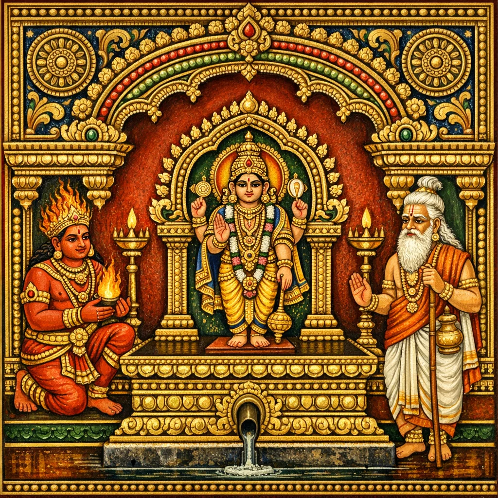 Bhagavān Agni inicia uma exposição técnica, porém carregada de sentido ritual, sobre o piṇḍikā-lakṣaṇa, tratando o pedestal/plinto como componente fundamental para a correta instalação da imagem e a integridade iconográfica. O capítulo estabelece primeiro cânones proporcionais: o comprimento da piṇḍikā deve igualar o da imagem, sua altura deve ser metade da imagem, e sua construção é prescrita em sessenta e quatro puṭa (camadas/fiadas), indicando uma gramática arquitetônica padronizada. Em seguida, passa a diretrizes procedimentais—deixar faixas/linhas em branco definidas, formar e purificar o koṣṭhaka (compartimento/célula) e assegurar simetria em ambos os lados—refletindo o princípio do vāstu de que pureza, nivelamento e segmentação medida geram auspiciosidade e durabilidade. Versos posteriores estendem a lógica das medidas aos detalhes iconográficos com unidades tradicionais (yava, gola, aṃśa, kalā, tāla, aṅgula), prescrevendo ajustes proporcionais para traços faciais e larguras corporais, e associando o resultado propício a Lakṣmī. O capítulo conclui com elementos compositivos—personificação da riqueza, mulheres assistentes com cāmara, Garuḍa e emblemas como o cakra—mostrando que pedestal, imagem e séquito formam um único conjunto sagrado pronto para a consagração segundo a práxis do Isāna-kalpa.