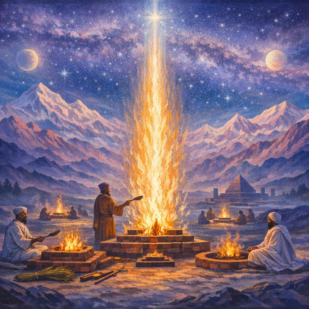 Agnicayana (construction and consecration of the fire-altar): continuation of the brick-laying/altar-building cycle with its accompanying yajus-formulas, deity-invocations, and protective/expansive rites that sacralize the altar as Prajāpati’s body and as the cosmic year.