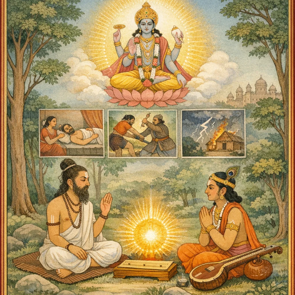 Sūta narra o afetuoso questionamento de Nārada a Sanandana após um ensinamento sobre o Si em Maithilā. Nārada pergunta como evitar as três espécies de aflição. Sanandana responde que a vida encarnada é, do ventre à velhice, marcada pelo sofrimento tríplice, e que o remédio supremo é alcançar Bhagavān—bem-aventurança pura além de toda agitação. Em seguida, expõe os meios: conhecimento e prática; o conhecimento é duplo—śabda-brahman derivado do Āgama e para-brahman obtido pelo viveka (discernimento)—apoiado no modelo de vidyā inferior/superior do Atharvaṇa-śruti. O capítulo estabelece uma semântica teológica regrada: “Bhagavān” designa o Supremo Imperecível; bhaga é definido como seis opulências (soberania, força, fama, prosperidade, conhecimento, desapego), e afirma-se que o termo se aplica propriamente a Vāsudeva. Declara-se que o Yoga é o único destruidor dos kleśa, e introduz-se a história de Keśidhvaja–Khāṇḍikya (Janaka): um conflito pela realeza torna-se cenário de prāyaścitta, guru-dakṣiṇā e do ensinamento de que a avidyā é o “eu” e o “meu” projetados no não-Si, culminando na volta ao Yoga e ao conhecimento do Si.