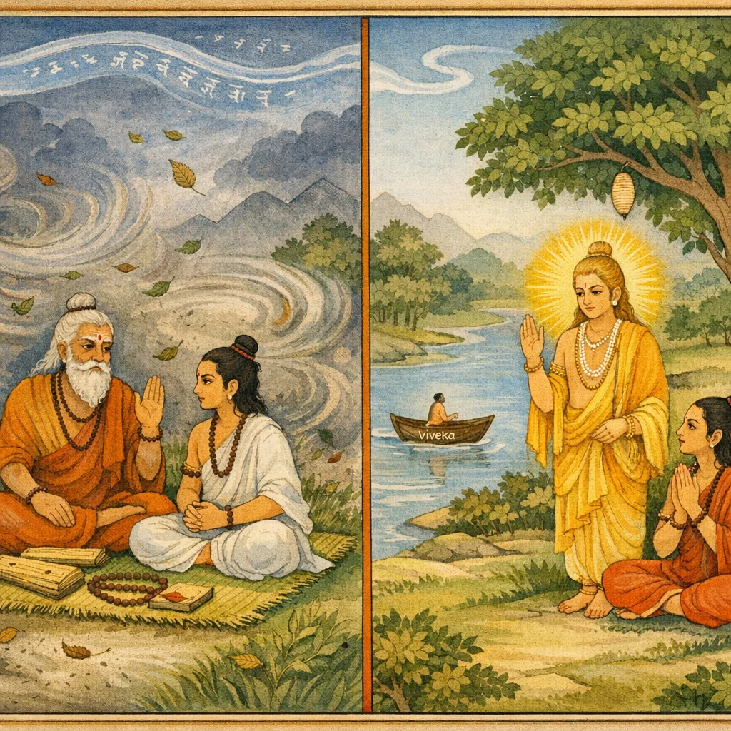 Com a barca do discernimento—cujo leme é o perdão, cuja essência é a verdade e que firma o dharma—impulsionada velozmente pelo vento da renúncia, deve-se atravessar o rio do samsara.