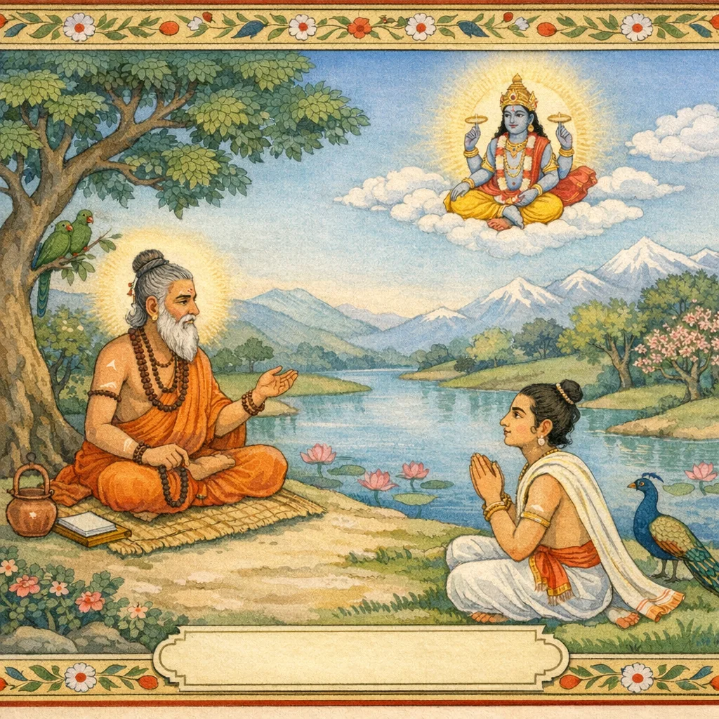 Tendo alcançado, por suas próprias austeridades, o senhorio único dos sete mundos, certa vez viu, num jardim, uma mulher resplandecente com muitos ornamentos florais.