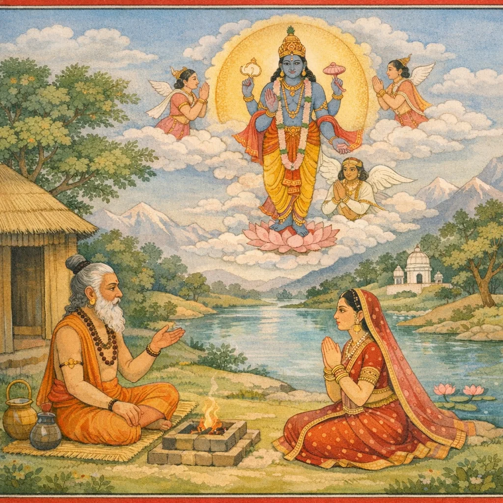Nesse ínterim, os supremos ṛṣis recitaram os Vedas, proclamando: «Que haja bem-aventurança para os brāhmaṇas, para as vacas, para as mulheres e para os ascetas».