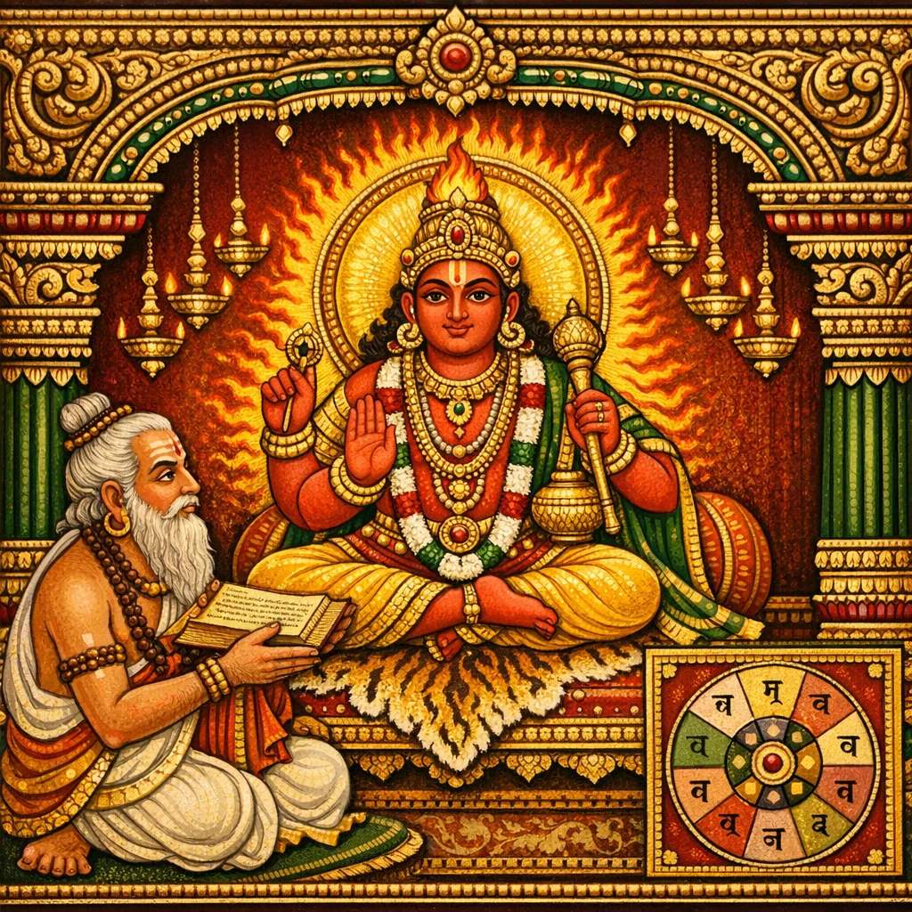 Этот раздел служит завершающим маркером предыдущей грамматической темы, объявляя об окончании главы о kāraka (падежно-ролевых отношениях) в части Vyākaraṇa «Агни-пураны». Колофон утверждает преемственность энциклопедического курса: грамматика рассматривается как формальная Vidyā, охраняющая смысл в ритуале, правоведении и толковании śāstra. Сразу после завершения текст переходит к следующей области наставления — samāsa (сложные слова, композиты), обозначая систематическое продвижение от синтаксических отношений (kāraka) к морфолого-семантическому сжатию (samāsa). Тем самым повествование показывает агнея-педагогику: техническая наука о языке передаётся как дисциплинированный инструмент для Дхармы и точной передачи знания.