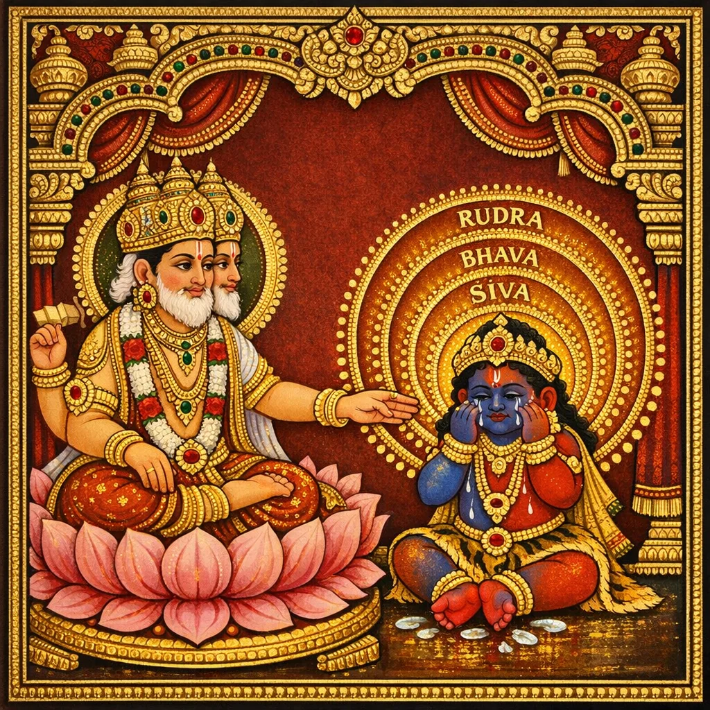 ब्रह्मा तं रुदन्तं प्रत्युवाच—“किं रोदिषि?” स पुनरब्रवीत्—“तृतीयं मे नाम देहि।”