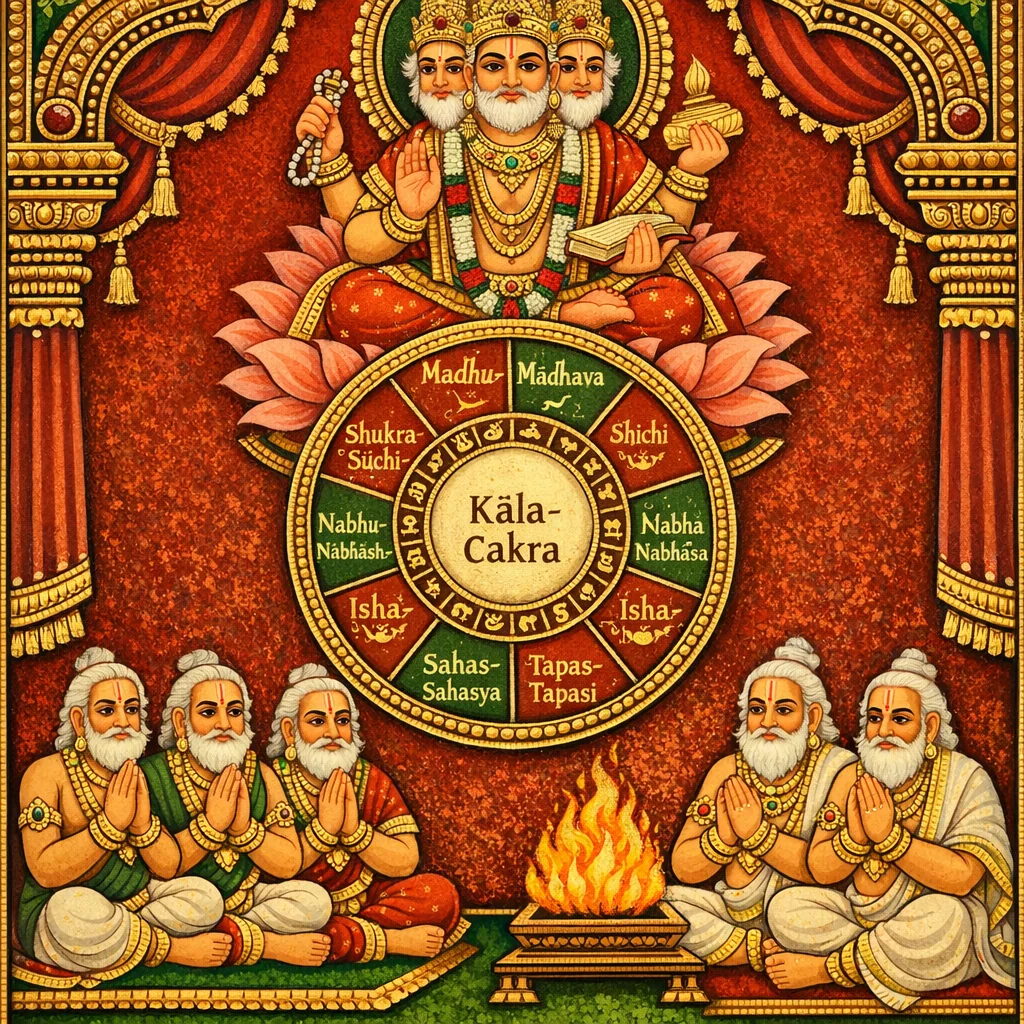 No bhuvana-distance measures dominate the sampled material; the chapter’s ‘technical data’ is calendrical-astronomical in form—month-pairs and the six ṛtus—used to encode cosmic order through time units (ahorātra, māsa, ṛtu, ayana, saṃvatsara).