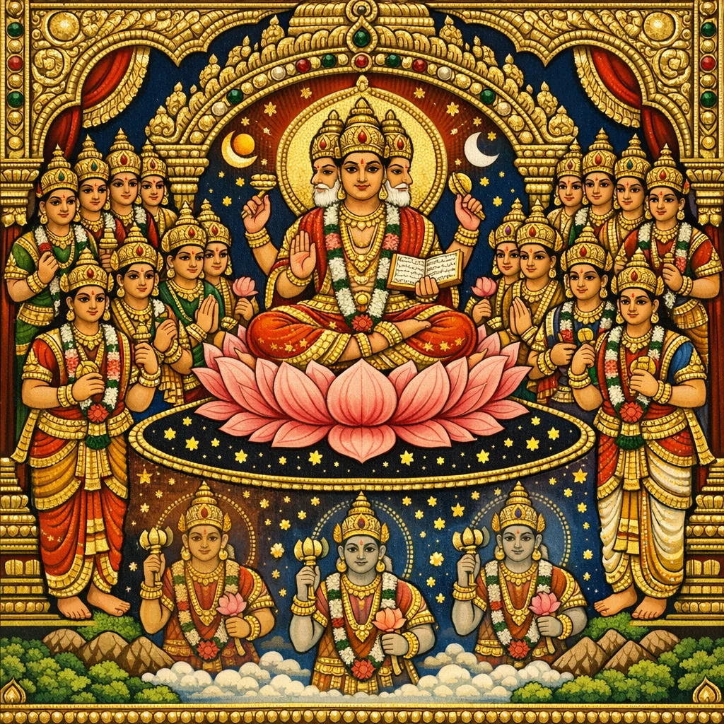 The chapter anchors certain divine groups in a Marīci–Kaśyapa lineage (Kaśyapa as a key progenitor), while also attributing some collectives (e.g., Sādhyas/Vasus/Viśvedevas in the sample) to Dharma’s sons—showing how Purāṇic taxonomy often blends descent and function.