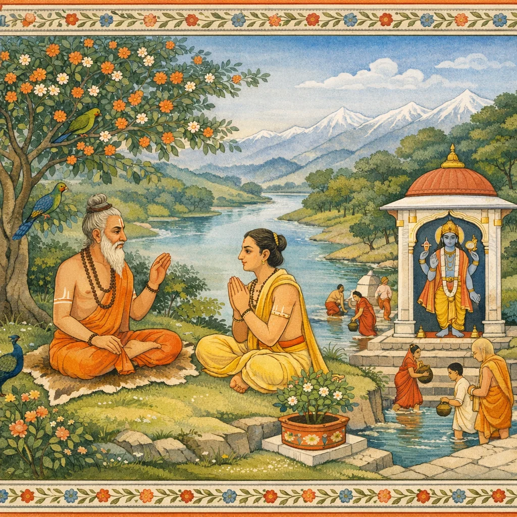 ऋषयः सूतं कृष्णकथाश्रवणे प्रशंसन्ति, पुनश्च व्रतदानपूजाविधानं तथा पूर्वस्नानविधिं च पृच्छन्ति। सूतः भक्तेः परमं मोक्षप्रदत्वं प्रतिपाद्य नूतनां पुण्यकथां प्रवर्तयति—मथुरायां नारदः अम्बरीषराजानं समागत्य तेन परं ब्रह्म निराकारं साकारं च कथं ज्ञेयम्, सर्वार्थसाधनं पूजनं च किमिति प्रश्नितः। नारदः हरिभक्तिं परं धर्मं निरूपयति, केवलकर्मकाण्डात् श्रेष्ठतां दर्शयन् वैष्णवाचारान् व्यवस्थितान् वदति—यम-नियमाः, मनोनिग्रहः, सत्यवाक्यं, नामस्मरण-जपः इत्यादयः। स्त्रीशूद्रादीनामपि आगमिकपूजया दिव्यनाम्ना च सुलभा भक्तिरिति प्रतिपाद्य, अन्ते द्विविधं ध्यानं उपदिशति—निर्गुणध्यानं दीपोपमया स्थिरान्तःप्रकाशं जनयित्वा कैवल्यप्रदं, तथा सगुणध्यानं शङ्खचक्रगदापद्मधारिणं चतुर्भुजं विष्णुं भूषणैः सह चिन्तयित्वा शुद्धिं विष्णुलोकप्राप्तिं च ददाति।