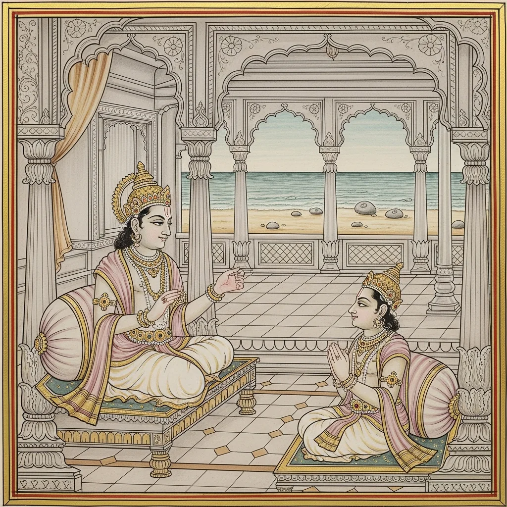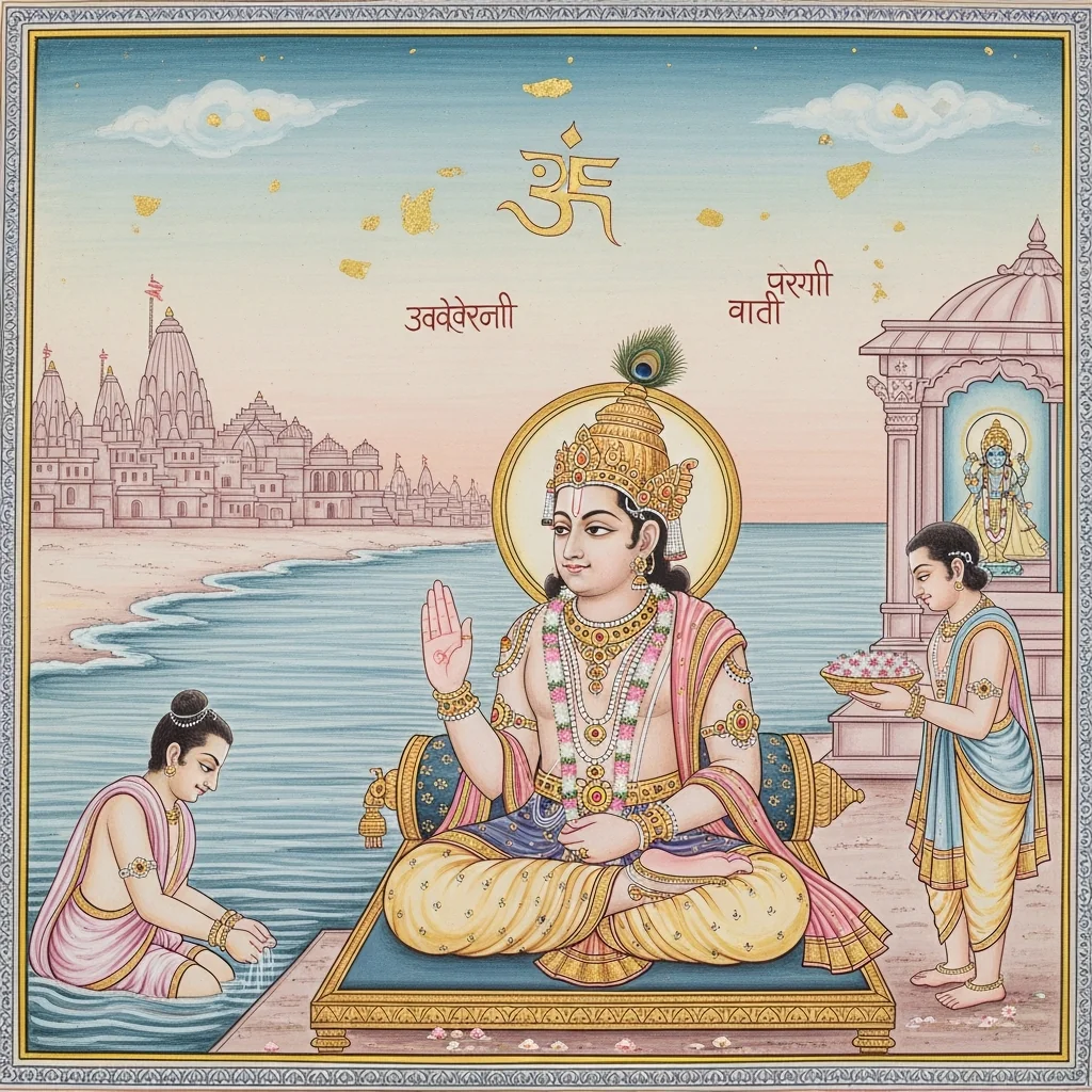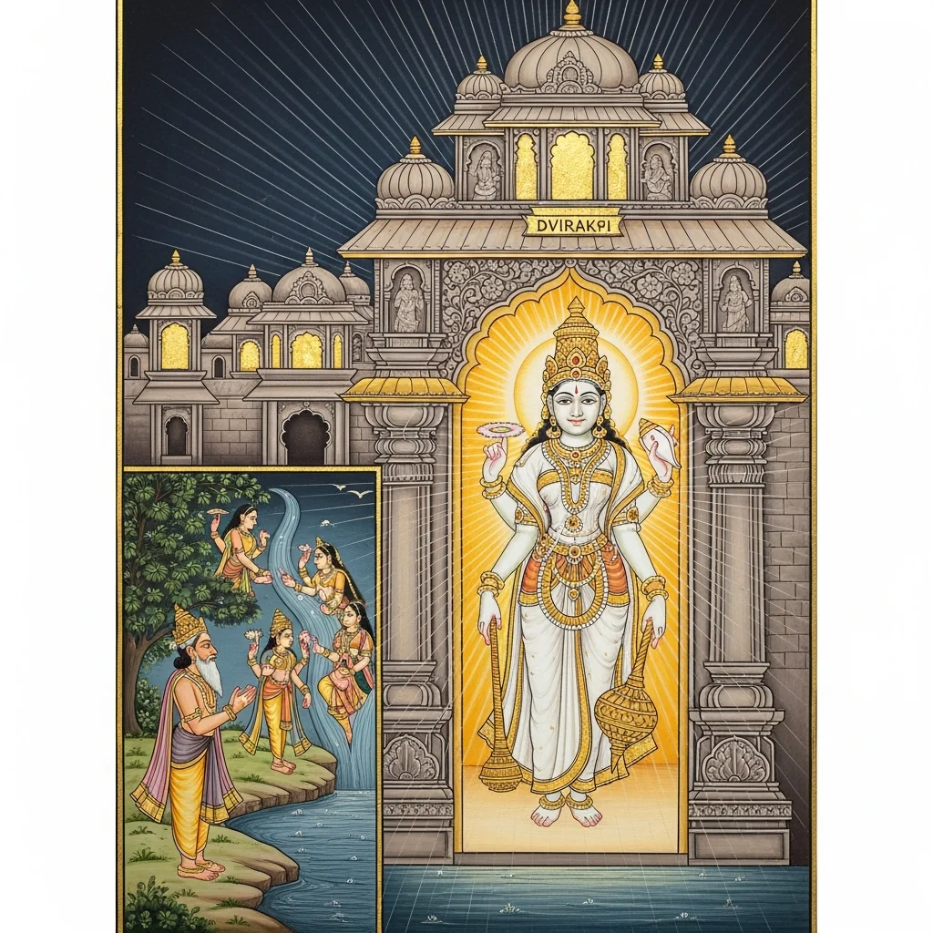 This section is anchored in the western coastal-sacred geography associated with Dvārakā and its wider Yādava/Vaiṣṇava memory field, extending to Prabhāsa as an epic-afterlife locus. It uses the sea, submerged city motifs, and pilgrimage networks to connect Krishna-centric narrative history with tīrtha practice and ethical reflection in Kali-yuga.