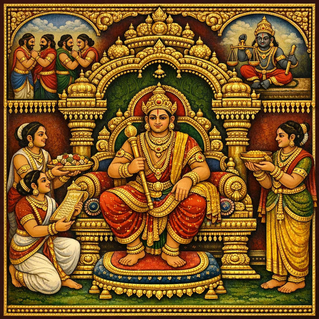 செல்வத்தின் ஓடைகளைப் பொழிவிப்பதால் தேவர்களில் முதலில் வருணன் என நினைக்கப்படுகிறான். மேலும் பொறுமையால் உலகங்களைத் தாங்கும் பூமியரசன் உண்மையிலேயே ‘பார்த்திவன்’ (பூமியின் அரசன்) ஆகிறான்.