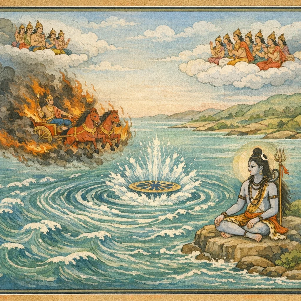 Shiva burns Jalandhara’s chariot with the fire of his eye (netra-agni) and fashions a formidable rathanga/chakra in the ocean by mere play (lila). When Jalandhara attempts to wield/withstand the weapon, he is split in two and falls, demonstrating the supremacy of Shiva’s tejas over demonic pride.