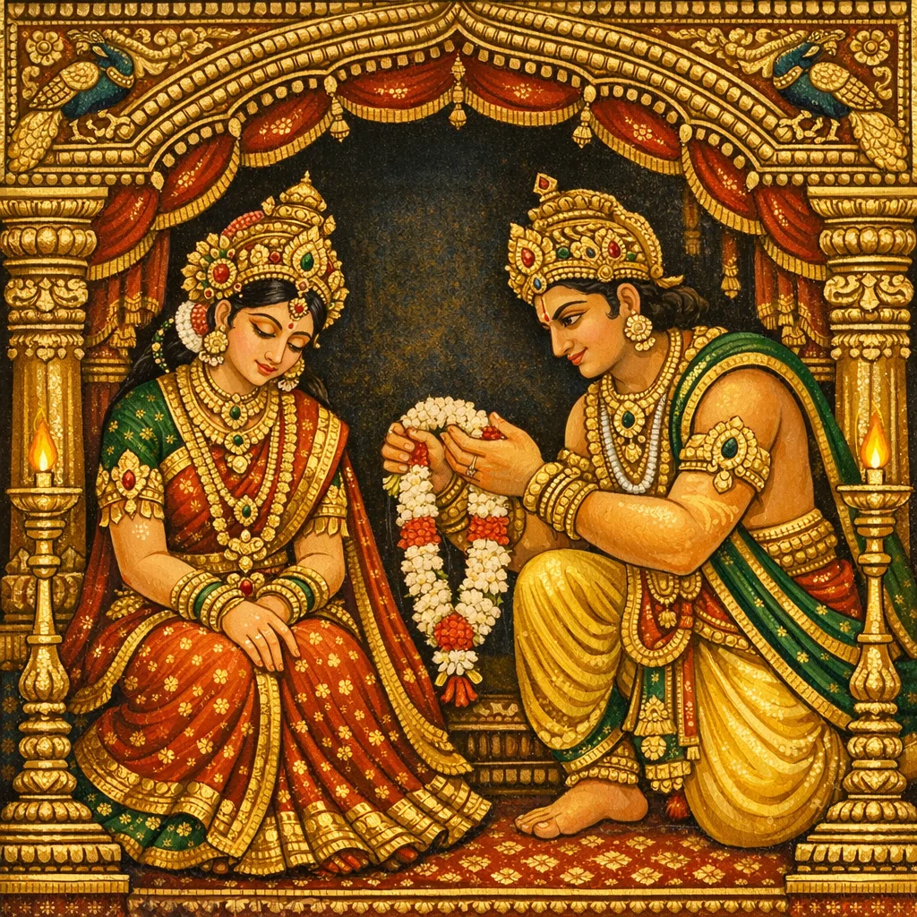 ధర్మం, అర్థం, కామం, మోక్షం—ఈ విషయాల ద్వారా శృంగారరసం పోషింపబడుతుంది; అలాగే ఆలంబన (ఆశ్రయ-వ్యక్తి/వస్తువు) యొక్క ప్రత్యేక రూపాలు మరియు వాటి విశిష్ట లక్షణాలచేత అది నిరంతరం వికసిస్తుంది।