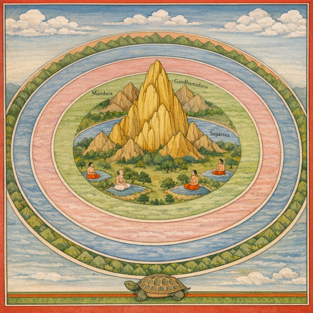 తూర్పున మందరము, దక్షిణాన గంధమాదనము; పడమర వైపున విపులము, ఉత్తరాన సుపార్శ్వము—ఇలా సంప్రదాయంగా స్మరించబడతాయి।
