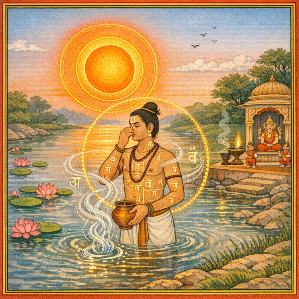 ‘ఆ తత్త్వరూపం నుంచే ఈ ఆపః జన్మించాయి; ఆ జలాలకు నేను ప్రణామం చేస్తున్నాను’ అని నమస్కరించాలి. ఆపై సాధకుడు శిరస్సులోని ఏడు ద్వారాలను నియంత్రించి ఆపివేయాలి.