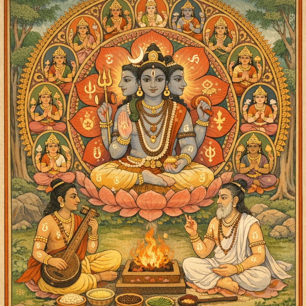 మనోహర దేవతలు దర్శనమిచ్చారు—వారి కిరీటాలపై బాలచంద్రుడు స్థాపితమై, పద్మాసనంపై కూర్చుని, ఆభరణాలతో అలంకృతులై, త్రినేత్రులై, చేతుల్లో శూలం, వజ్రాస్త్రం, ధనుస్సును ధరించారు.