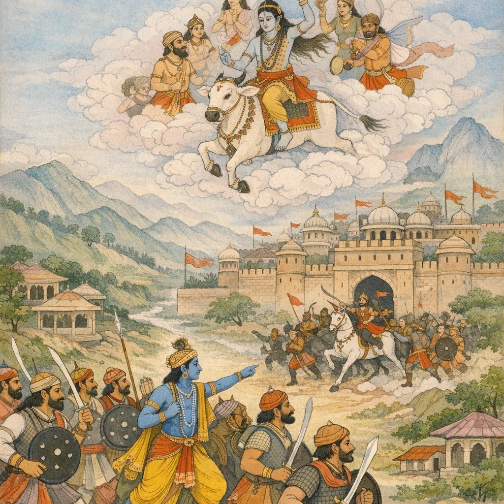 Kṛṣṇa as the decisive protector and strategist (summoning Garuḍa, leading an akṣauhiṇī force) and Rudra as the formidable guardian (arriving with pramathas, mounted on Nandin) are foregrounded as the battle commences.
