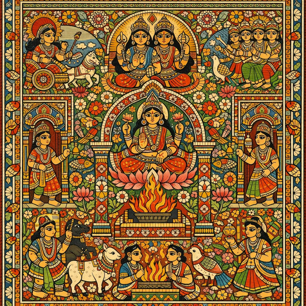 సమిధతో అగ్ని ప్రజ్వలితుడయ్యాడు—సుసమిద్ధుడు, వరేణ్యుడు. గాయత్రీ ఛందస్సు—ఇంద్రియం (ఇంద్రుని వీర్యం); త్ర్యవిర్గౌర్ (త్రివిధ గొర్రె/త్రిగుణ గో) మరియు వయః (ప్రాణబలం)—ఇవన్నీ వారు స్థాపించారు.