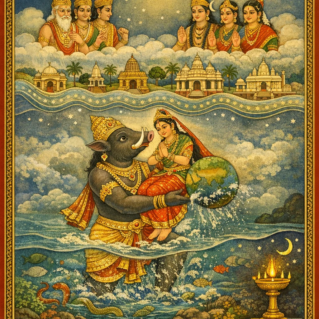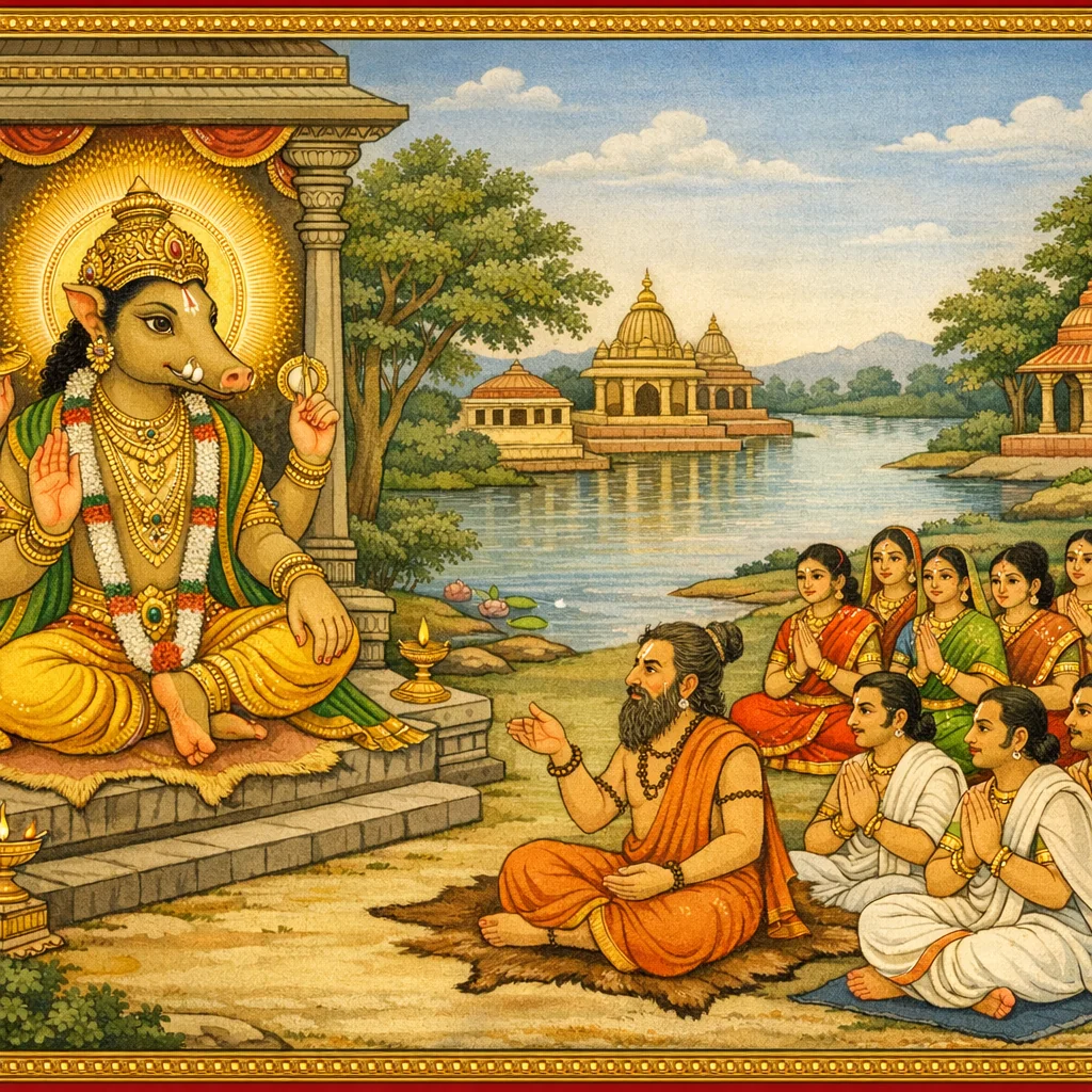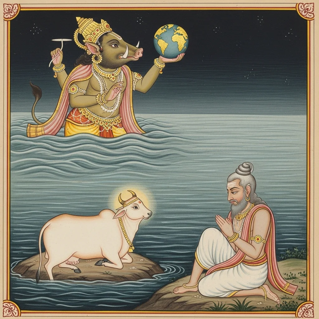 एकोर्णवप्रलये नर्मदागोरूपिण्या रक्षणम् तथा वाराहावतारवर्णनम् | Markandeya’s Rescue by Narmadā (Cow-Form) and the Varāha Cosmogony