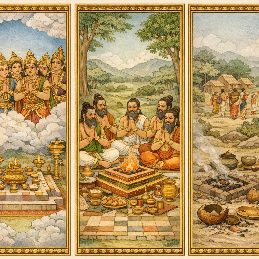 धर्मारण्ये देवसत्र-प्रवर्तनं लोहासुरोपद्रवश्च | The Devas’ Satra in Dharmāraṇya and the Disruption by Lohāsura