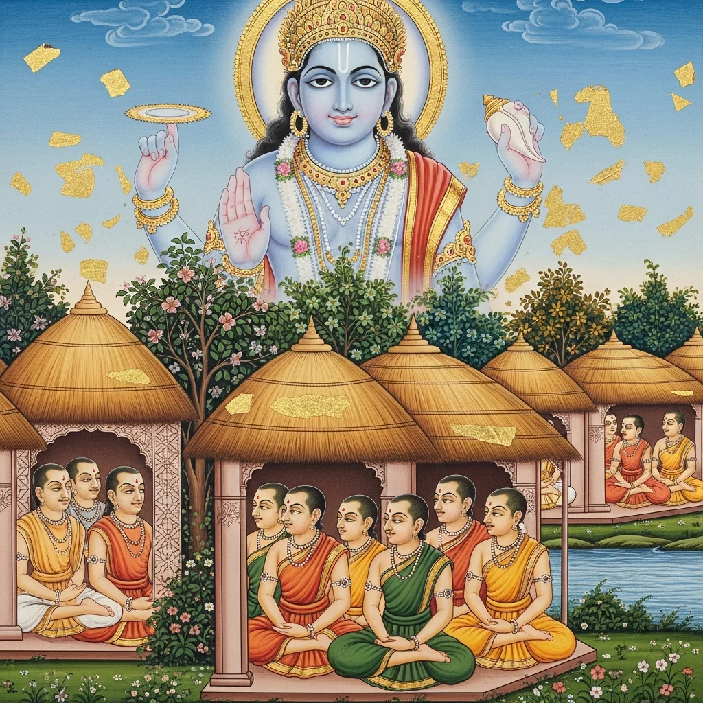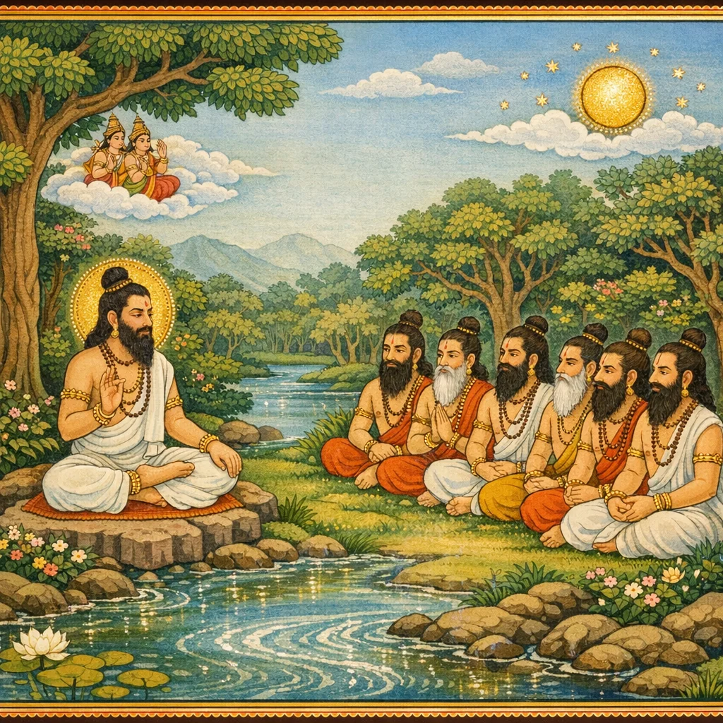 धर्मारण्ये देवसमागमः तथा ऋष्याश्रमस्थापनम् (Divine Assembly in Dharmāraṇya and the Establishment of Ṛṣi-Āśramas)