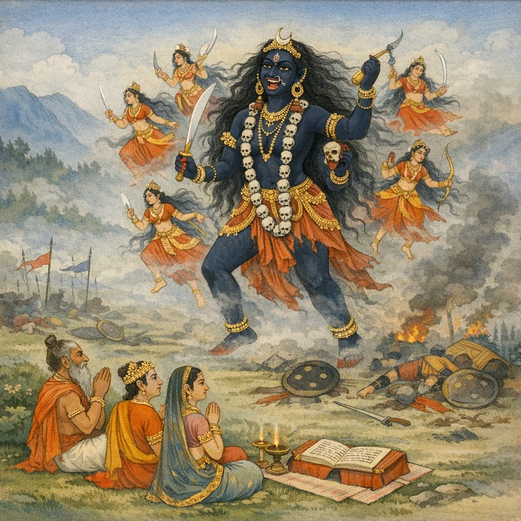 “విను, హే వరారోహిణీ—హే కాలరాత్రీ, హే మహాప్రభే. హే దేవేశీ, ఏ స్త్రీ గర్భవతిగా ఉండి, అడవి-స్త్రీ వేషధారణను ధరించునో…”