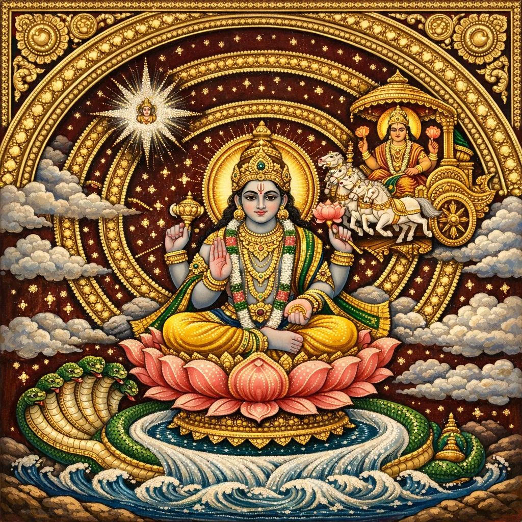 และพระวิษณุนั้นแลคือพรหมันเอง ผู้ซึ่งจากพระองค์จักรวาลทั้งปวงบังเกิดขึ้น. รถศึกของภาสกร (พระอาทิตย์) มีขนาดเก้าพันโยชน์.