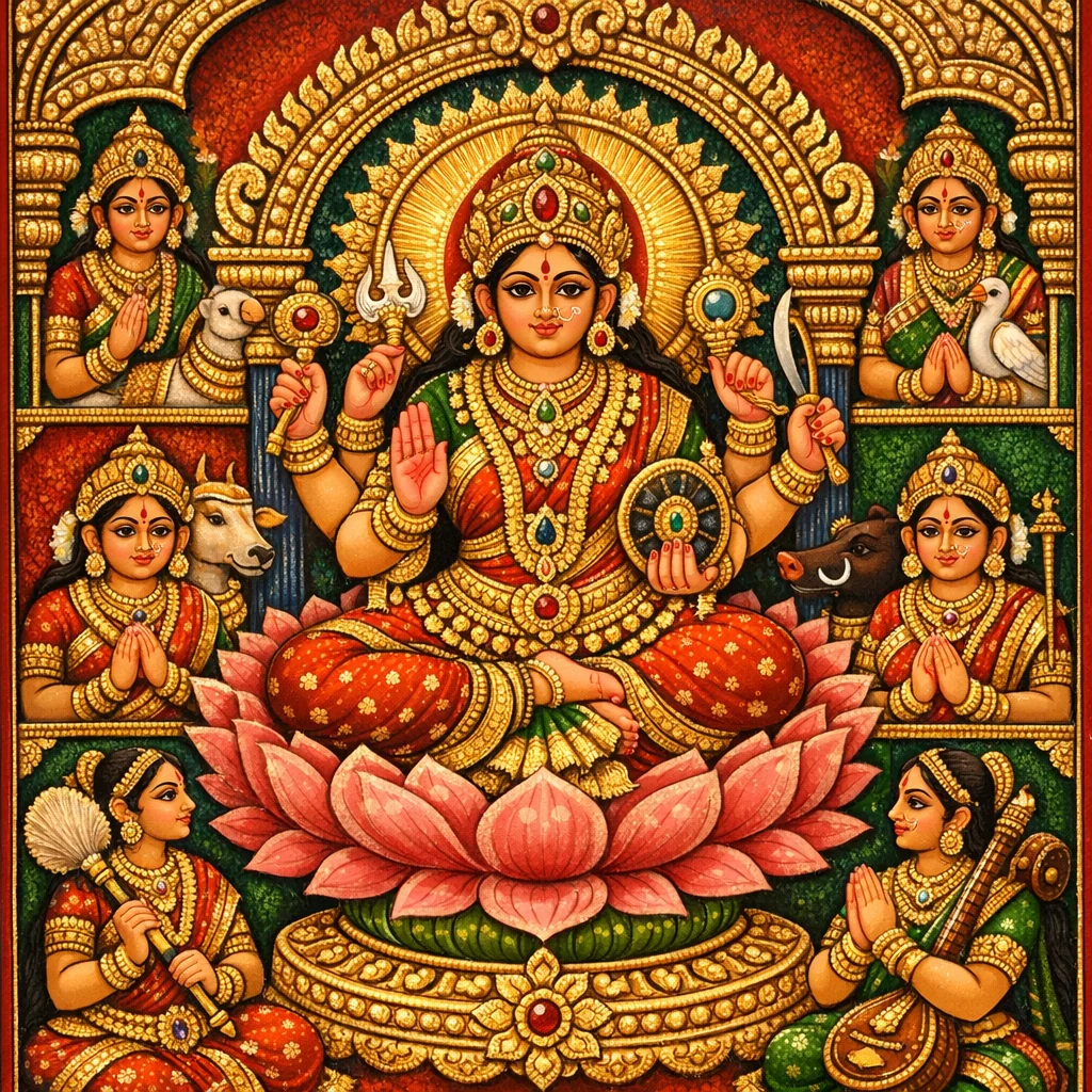 ด้วยวิธีนั้น รุทรจามุณฑาในฐานะนาฏेशวรีจึงร่ายรำ; นางเองคือมหาลักษมี ประทับนั่งและมีสี่พระพักตร์۔