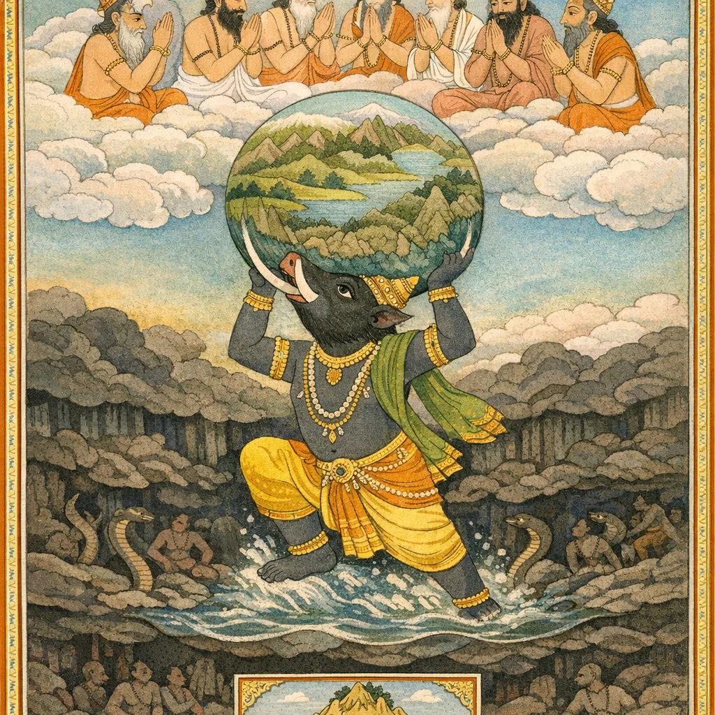 เพื่อยกแผ่นดินขึ้น พระองค์เสด็จเข้าสู่รสาตละ แล้วทรงใช้เขี้ยวอันคมยกแผ่นดินขึ้นมา—ทรงเป็นที่พึ่งแห่งอาตมันทั้งปวง เป็นผู้ทรงค้ำจุนและยกโลกไว้۔