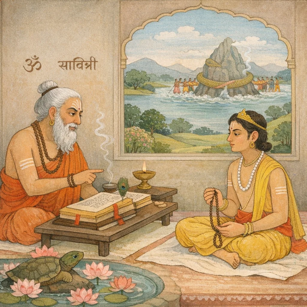Gāyatrī is proclaimed the Mother of the Vedas and the supreme japa; its recitation is a sacrifice (japa-yajña), and it is said to be ‘weighed’ as equal to the four Vedas, leading the disciplined student toward the supreme state.