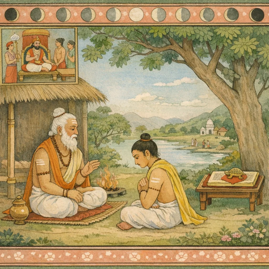 พึงสาธยายมหาวยาหฤติทั้งหลายที่มีโอมเป็นบทนำอยู่เสมอ; ตลอดหนึ่งปีให้ดำรงตนบริสุทธิ์ กินเพียงครั้งเดียวในยามค่ำ ด้วยอาหารบิณฑบาต.