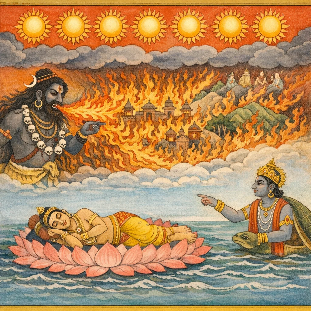 ततस्ते रश्मयः सप्त सूर्या भूत्वा चतुर्दिशम् / चतुर्लोकमिदं सर्वं दहन्ति शिखिनस्तथा