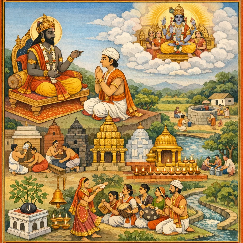 ข้าแต่มหาราช ผู้สร้างสวนรื่นรมย์ ผู้สร้างเทวสถาน และผู้ขุดสระพร้อมตั้งหมู่บ้าน—ย่อมได้รับการสักการะเคียงคู่กับพระหริ (วิษณุ)۔
