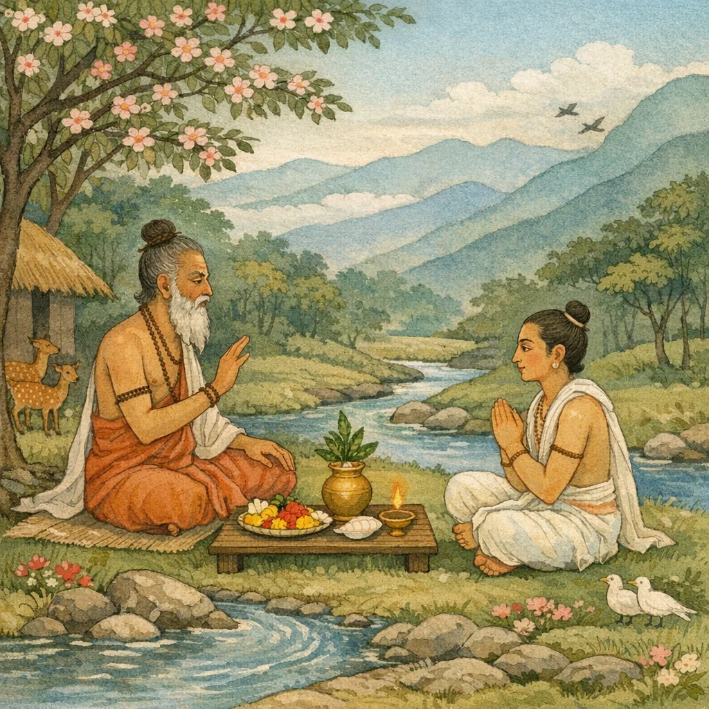 พระนางเหมาṅคีทรงแสดงคัมภีร์ศักดิ์สิทธิ์ที่มีภาพประกอบแก่พระราชาวีรวรรมา ภายในกล่าวถึงอวตารและผังจักรวาล—โลกาลกะ ทวีปทั้งเจ็ดและมหาสมุทรทั้งเจ็ด เมื่อทอดพระเนตรแม่น้ำในภารตะและตีรถะแห่งอินทรปรัสถะกับประยาค พระนางระลึกชาติได้ว่าเคยเกิดเป็นนางคณิกาชื่อโมหินี ถูกโจรฆ่า ต่อมามีฤๅษีไวขานสะให้น้ำประยาคดื่ม จึงได้เกิดใหม่ด้วยบุญและได้เป็นราชินี พระนางปฏิญาณว่าจะไม่เสวยอาหารจนกว่าจะเสด็จไปประยาคพร้อมพระราชา เสียงจากฟากฟ้า (อากาศวาก) ยืนยันเรื่องราวและสั่งให้จาริกแสวงบุญพร้อมอาบน้ำพิธีเพื่อให้สมปรารถนา ณประยาคที่ศิวะ-ตีรถะ พระราชาสรรเสริญเทวะผู้รุ่งเรืองสององค์ แล้วพระหริและพระพรหมปรากฏ ชมพระนางเหมาṅคีที่ช่วยนำสวามีผู้หลงกามสุขให้หันสู่ธรรม และประทานความมั่นใจว่าจะได้ไปสตยโลกและไวกุณฐะ ปิดท้ายด้วยผลแห่งการฟังหรือสาธยายบทนี้ (ผลศรุติ)