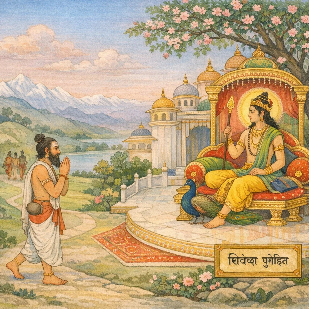 Viśvāmitra’s providential arrival at the supramundane abode of Śiva’s son (Kārttikeya), his reverential praise, and Kārttikeya’s commissioning of Viśvāmitra to perform Veda-sanctioned saṃskāras and serve as purohita.