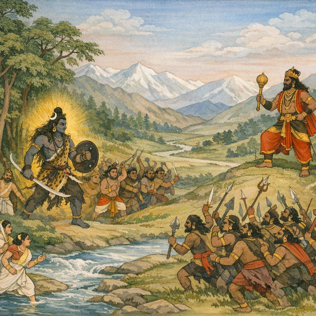 ครั้งแล้วครั้งเล่าได้เกิดศึกอันน่าสะพรึงกล้ายิ่ง ระหว่างคณะคณะแห่งพระศิวะกับเหล่าไทตยะผู้ยอดเยี่ยม เหล่าคณะคณะนั้นชื่นบานและชำนาญในการใช้อาวุธทิพย์ชั้นสูง จึงได้ชัยชนะในกาลนั้น