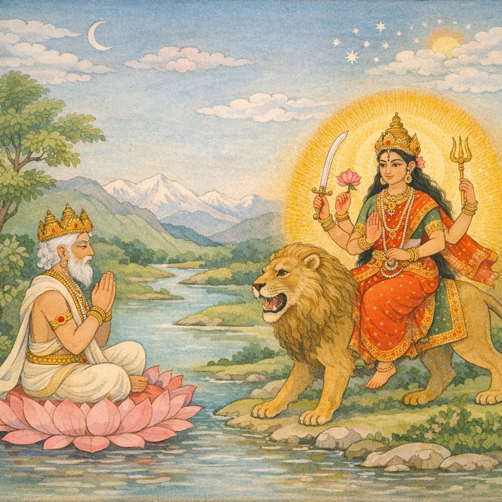 Brahmā narrates that after Viṣṇu’s departure he praised Devī (Yogānidrā/Durgā), whereupon she manifested visibly as Caṇḍikā before him.