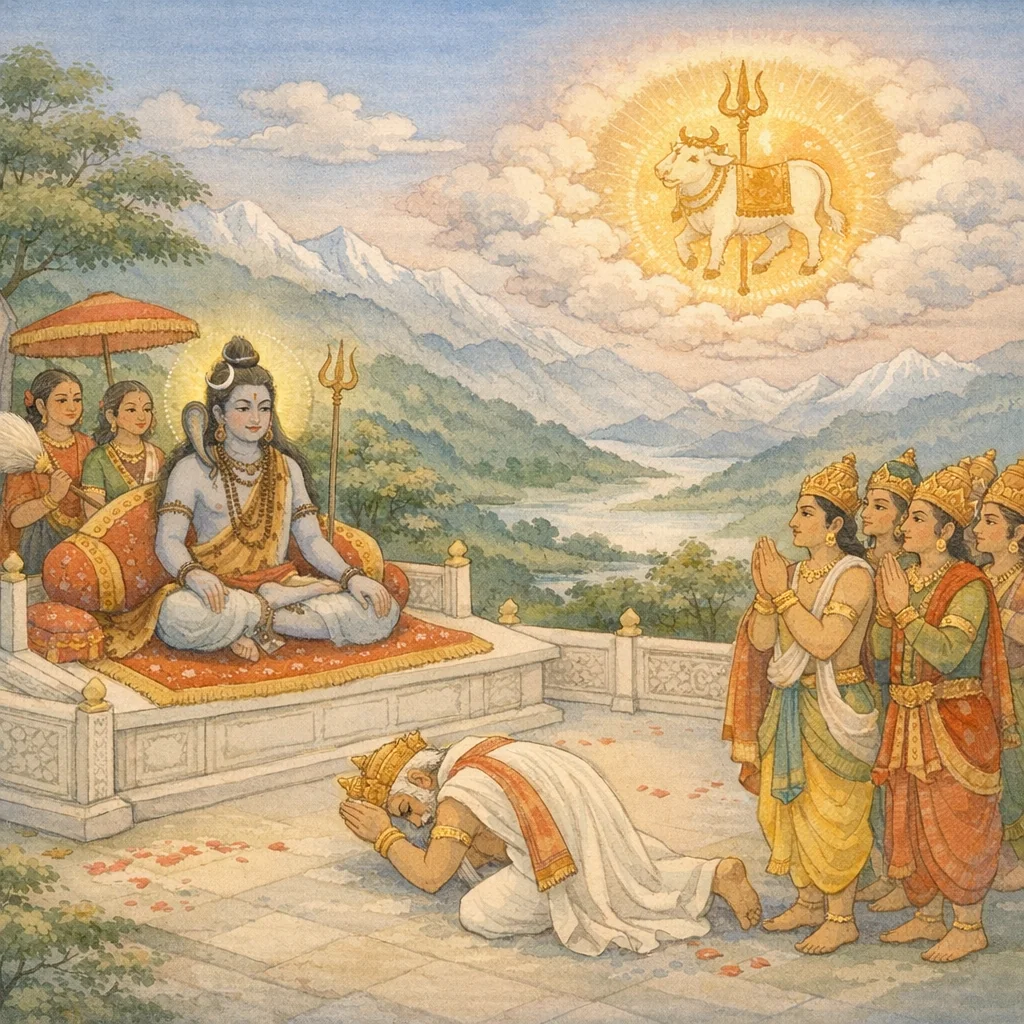 แล้วศัมภูผู้สัตย์จริงต่อวาจา พร้อมด้วยหมู่คณะคณะคณาทั้งปวง และพร้อมด้วยพระชายาของพระองค์ เสด็จถึงพระธามอันเป็นทิพย์ด้วยความชื่นบาน ซึ่งงดงามด้วยภูเขาหิมวัต